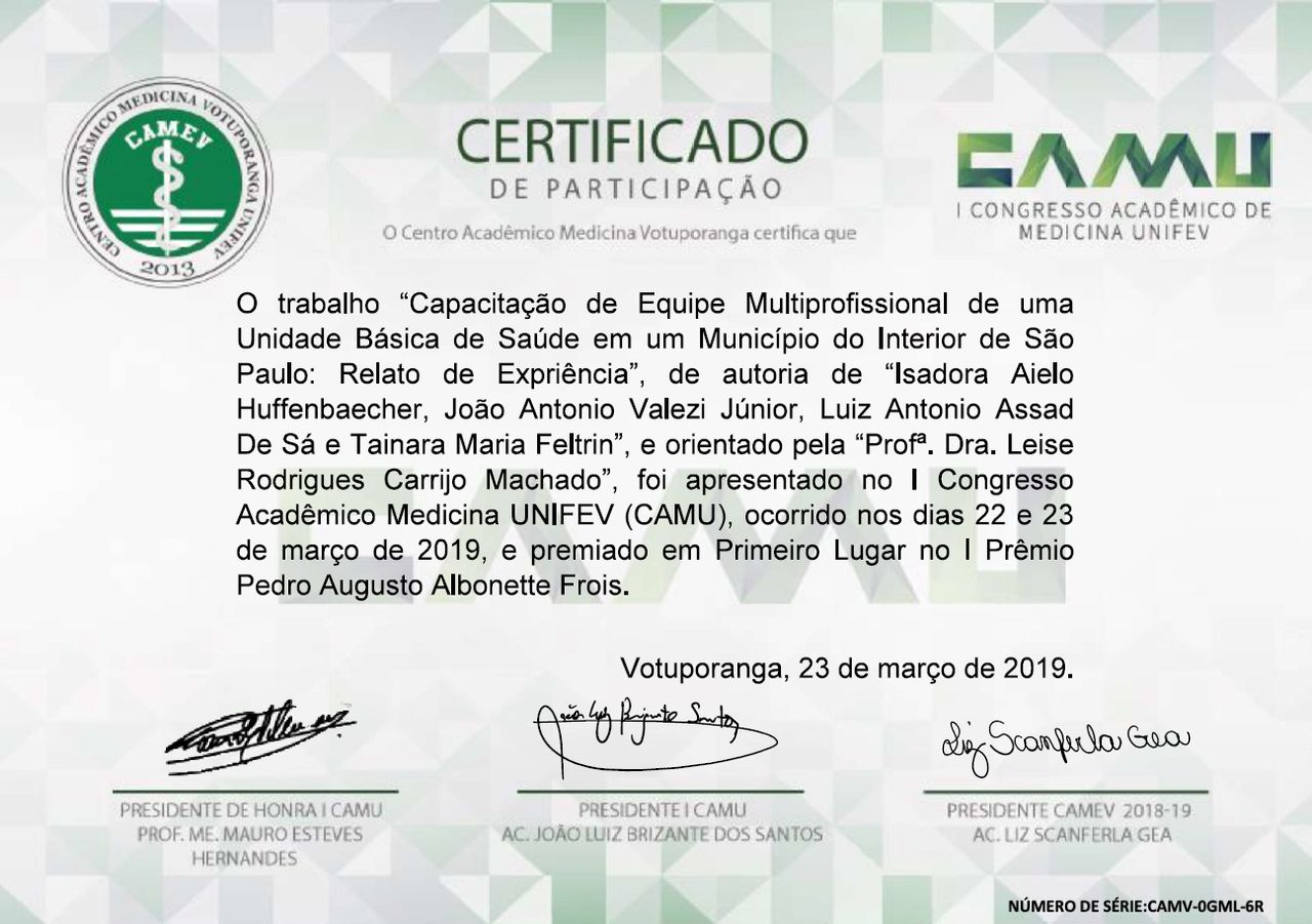 - I Prêmio Pedro Augusto Albonette Frois: 1º lugar - Título do trabalho: Capacitação de equipe multiprofissional de uma unidade básica de saúde em um município do interior de São Paulo: relato de experiência